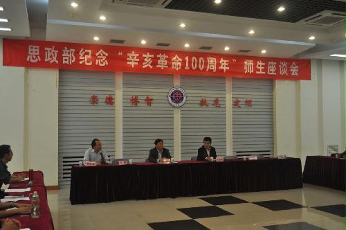 为纪念辛亥革命100周年,思政课教研部于10月8日下午在图书馆多功能厅举行主题为“鉴史承志·振兴中华”的师生座谈会。学院党委书记齐福荣,纪委书记、副院长钟南才,教务处处长石峰,党委办公室主任、宣传部部长王维新,党委办公室副主任、宣传部副部长王春红和思政课教研部全体教职工及大学生历史文化协会近40名会员参与了本次座谈。会议由思政课教研部副主任贾作璋主持。
