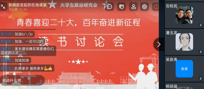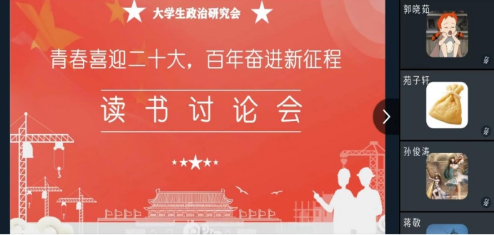春风吹拂,杨柳依依。4月21日晚,在beat365在线唯一官网、校团委指导下,大学生政治研究会通过钉钉线上会议的方式组织开展“青春喜迎党的二十大,百年奋进新征程”主题读书讨论会,来自beat365各个学院的近30位同学参加读书讨论会。
