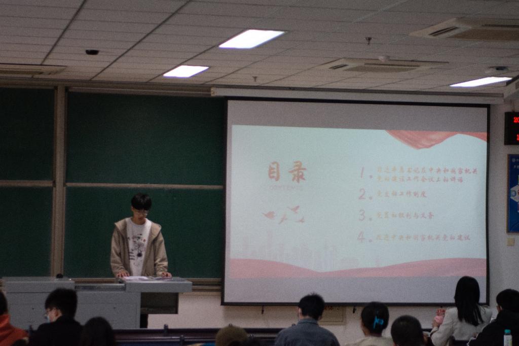 随后大学生政治研究协会会长张赛婵为同学们阐述了党支部工作制度即:1.党支部委员会工作制度。2.党员大会议事制度。3.三会一课制度。4.发展党员制度。5.党费收缴制度。6.党员廉政及联系群众制度。7.民主评议党员制度。8.外出党员管理制度和党员的权利与义务以及改进中央和国家机关党的建议。参会的同学都认识到了我党的管理方式与行政制度,不少同学表示受益匪浅。